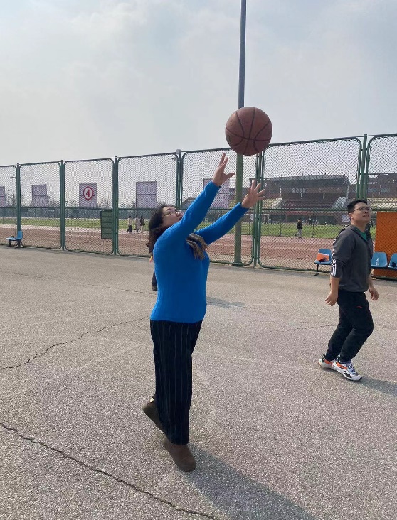 参加了投篮比赛的赵洪英老师平时很少参加体育运动,开始投篮练习时,球不是打板弹回,就是弹框而出,甚至还投出了三不沾,在其他运动达人的悉心指导下,顺利投进第一球后找到手感,连续投进5个球,勇夺投篮大赛第一名。