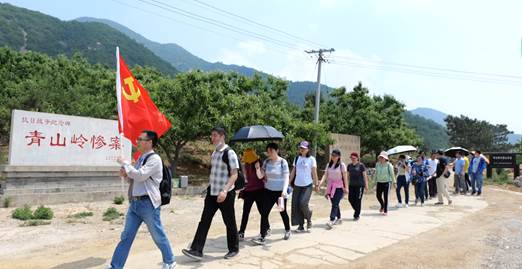 学院教师党员徒步十里红色长廊,亲身追寻红色足迹,体验当年革命先烈的战斗历程,感悟前辈们不屈不挠的战斗意志和艰苦奋斗的革命精神。十里红色长廊由下营镇刘庄子村爨岭庙烈士陵园出发,到青山岭村战备洞结束,全程5公里。路线蜿蜒曲折,有山路、有平地,途径果园、松树林、梯田等场景,根据当时抗战历史,共设置9个点位进行爱国教育,每个点位循环播放抗战时期该点位的红色革命故事。为庆祝建党100周年,全程每隔50米放置小音响,展示1921—2021党的百年时间,音响全程播放红色歌曲,营造浓厚红色氛围。