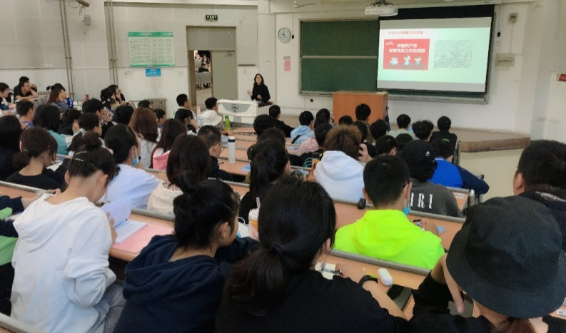 让爱国主义情怀在学生中牢牢扎根是高校开展大学生思想政治教育的重要一环。结合我校推进“四史”教育的工作部署,我院组织新生观看了“我和我的祖国”电影节选,通过影片展播的形式引导学生回顾历史,增强对伟大祖国、中华民族、中华文化、中国共产党、中国特色社会主义的认同感。同时,为了提高新生对中国共产党的认识,进一步端正入党动机,熟悉入党流程,我院开展了党的基本理论知识专题讲座。在介绍党的路线、方针、政策等知识的同时,鼓励大一新生主动学习党章、十九大报告,积极递交入党申请,向党组织靠拢。