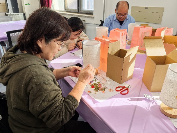 随后,手工老师详细讲解压花台灯制作流程、素材搭配及安全要点,从干花筛选到组件组装逐一演示,耐心解答疑问,老师们听得专注,纷纷记录关键步骤。实操环节,老师们精心构思、巧手创作:或以莲花诠释“出淤泥而不染”的廉洁内涵,或以松竹寓意刚正品格。大家相互交流技巧,现场充满温暖活力,忙碌的疲惫在创作中悄然消散。当一盏盏融入巧思的台灯点亮,柔和光芒透过干花散发独特韵味,老师们脸上满是成就感。