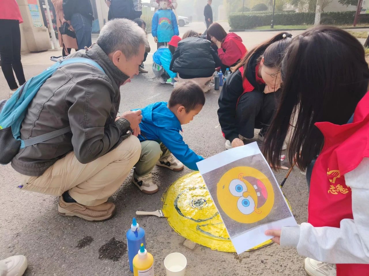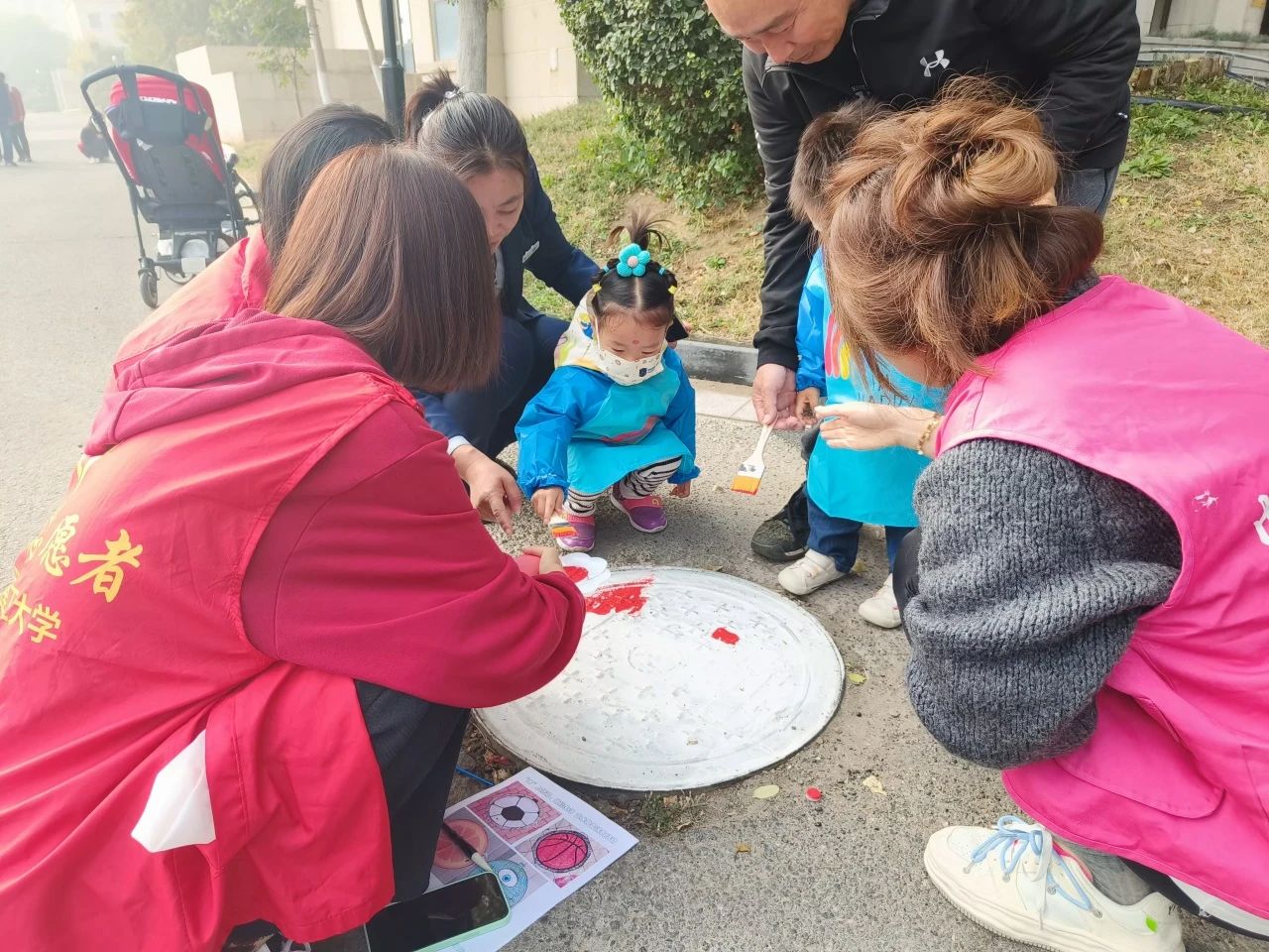 活动开始前,带队教师向小朋友们分发画笔、颜料、罩衣等工具并介绍涂鸭的技巧和注意事项。随后,志愿者带着小朋友们拿起手中的画笔认真地在井盖上进行创作。缤纷的元素在井盖上游走,每一抹色彩都洋溢着快乐,交织成一幅又一幅美丽的画作。