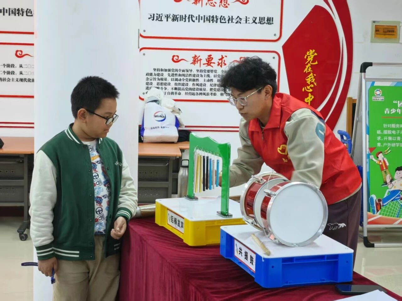 活动现场,志愿者们以“铝棒发声” “振动鼓”两大实验为切入点,通过亲手操作、现场演示的方式,带领孩子们沉浸式感受物理现象的奇妙。从“声音是如何产生的” “真空中能传播声音吗”等贴近生活的趣味提问出发,志愿者用通俗易懂的语言拆解声音振动、介质传播等核心原理,通过对比长短铝棒的音调差异,结合“高个子与矮个子跳绳”的生动类比,让孩子们直观理解振动快慢与音调的关联。